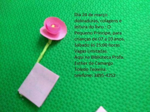 O Clube da Leitura com o apoio da Secretaria Municipal de Cultura promoverão a contação de história do livro: O Pequeno Príncipe, além de ouvir a história as crianças irão fazer dobraduras e colagens.