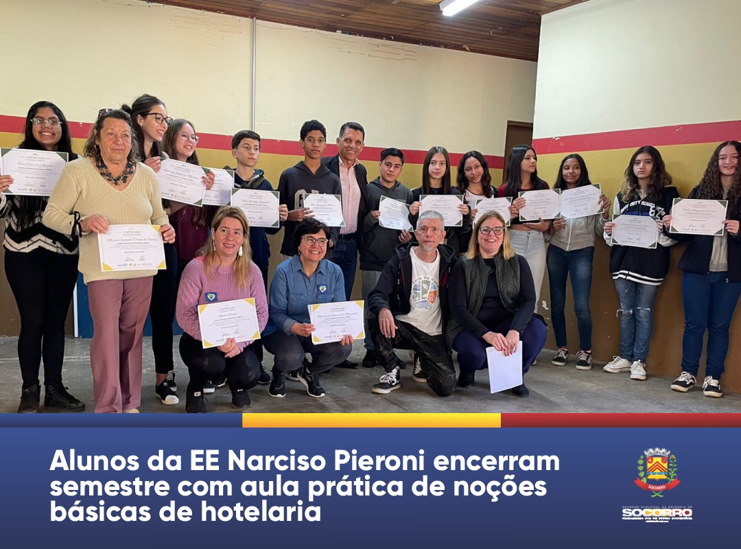 Em um dia marcado por aprendizado prático e celebração, os alunos da Escola Estadual Narciso Pieroni concluíram o semestre das aulas eletivas de Noções Básicas de Hotelaria e Turismo. O evento de encerramento contou com a presença do prefeito municipal, Ricardo Lopes, da secretária de turismo, Mônica Sartori, e de Marta de Oliveira Preto Pais.
