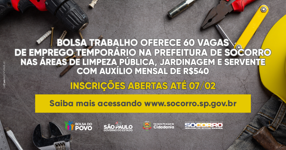 A Secretaria de Cidadania da Prefeitura de Socorro informa que encontram-se abertas, até 07 de fevereiro, as inscrições para o programa Bolsa Trabalho da Secretaria Estadual de Desenvolvimento Econômico.