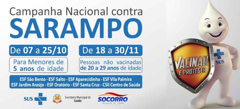 A Campanha Nacional de Vacinação Contra Sarampo, coordenada pelo Ministério da Saúde juntamente com estados e municípios, teve início na segunda-feira (07/10), em todo país. Em Socorro, oito unidades de saúde estão participando da campanha, são elas: Centro de Saúde, UBS Jardim Araújo/Teixeira, UBS Parque Ferrúcio/Aparecidinha, UBS Vila Palmira, UBS Jardim Santa Cruz, UBS Oratório, UBS São Bento e UBS Salto.