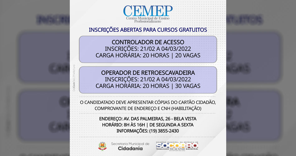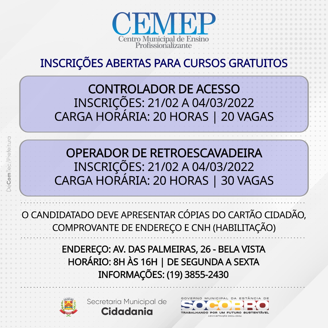 O Centro Municipal de Ensino Profissionalizante – CEMEP informa que, a partir de hoje (21/02) até 04/03, estão abertas as inscrições dos seguintes cursos gratuitos: