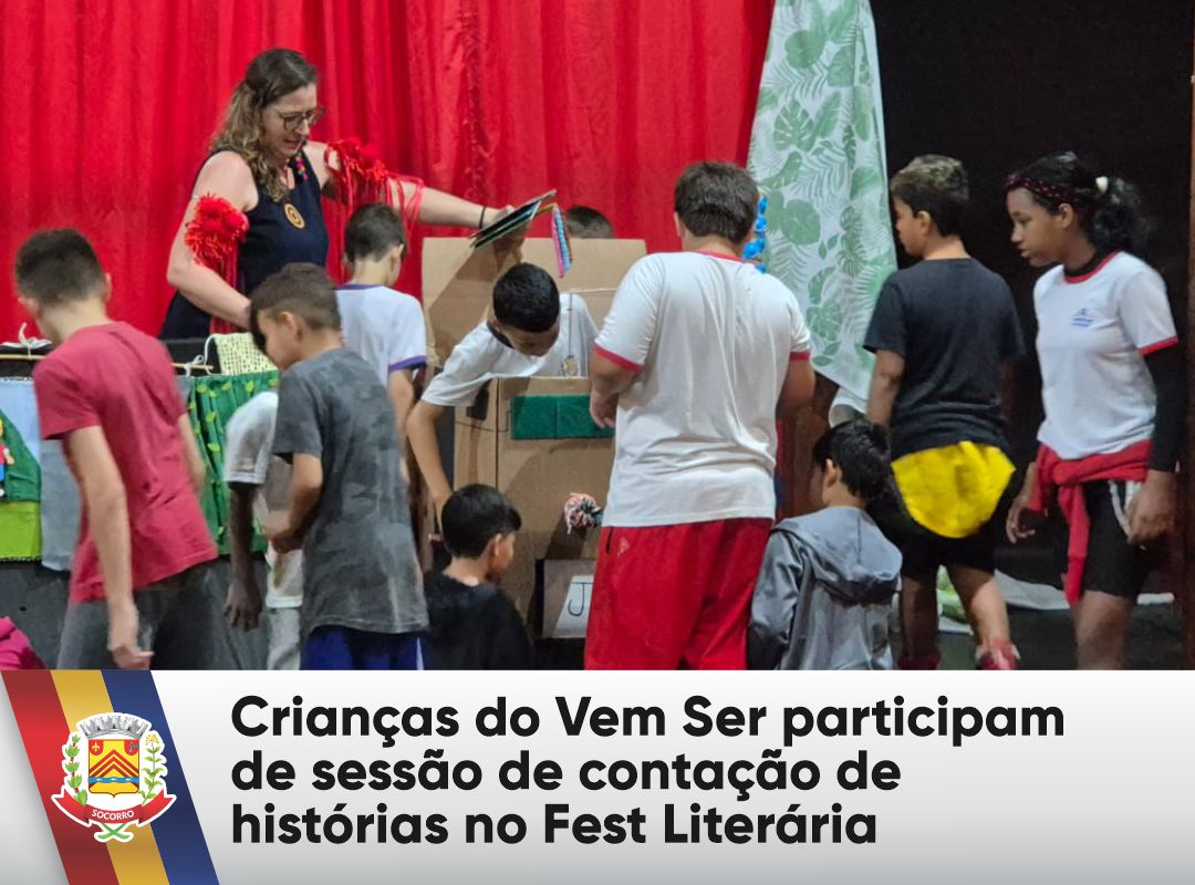 O 5º FESTHELP – Festival de Teatro de Socorro promoveu o Fest Literária, uma atividade voltada às crianças do Programa Vem Ser, das sedes Bela Vista e Santa Cruz. O encontro trouxe a apresentação “As Aventuras de Arthur”, conduzida pela contadora de histórias Luciana Pelatieri, em dois momentos distintos, pela manhã e à tarde.