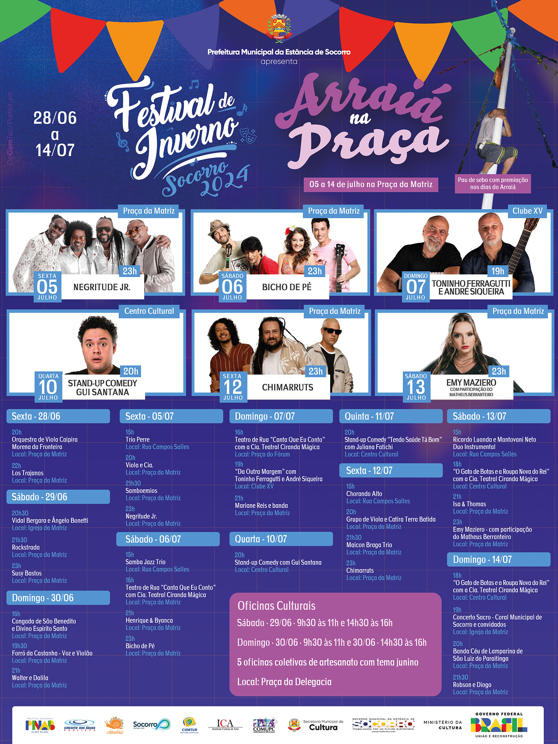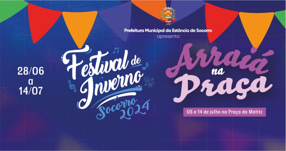 A Secretaria de Cultura da Prefeitura de Socorro divulgou as atrações que vão compor a programação do Festival Cultural de Inverno e Arraiá na Praça deste ano. O evento acontece de 28 de junho a 14 de julho, com atrações na Praça da Matriz, Centro Cultural, Praça do Fórum e outros pontos da cidade.