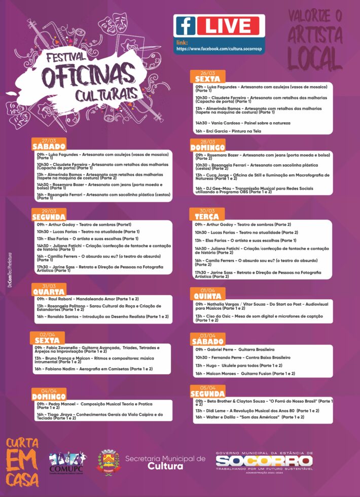 O festival de Oficinas Culturais, além de apoiar os artistas e oficineiros locais, o projeto oferece lazer e entretenimento para a população, especialmente os que estão em casa, devido à quarentena. A programação de março terá início na sexta-feira (26) e segue com atividades até o dia 05 de abril, podendo ser estendida para os próximos meses.