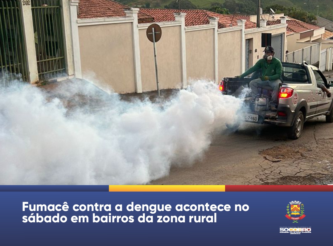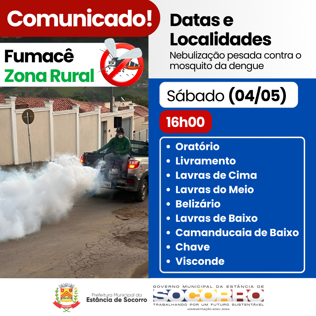 A nebulização pesada contra a dengue, o chamado “fumacê”, acontece neste sábado, 04 de maio em bairros da zona rural de Socorro. A aplicação será realizada nos locais e ruas considerados de maior risco nestas áreas, onde há a possibilidade de criação e desenvolvimento do mosquito transmissor.