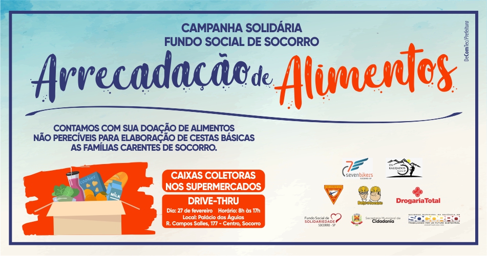 Diante disso a equipe do Fundo Social de Solidariedade de Socorro, cuja presidente é a primeira dama do município, Edvânia Faria Lopes, está encabeçando uma campanha especial solidária, para arrecadar alimentos não perecíveis, que posteriormente comporão cestas básicas a serem distribuídas, através da Assistência Social do município.