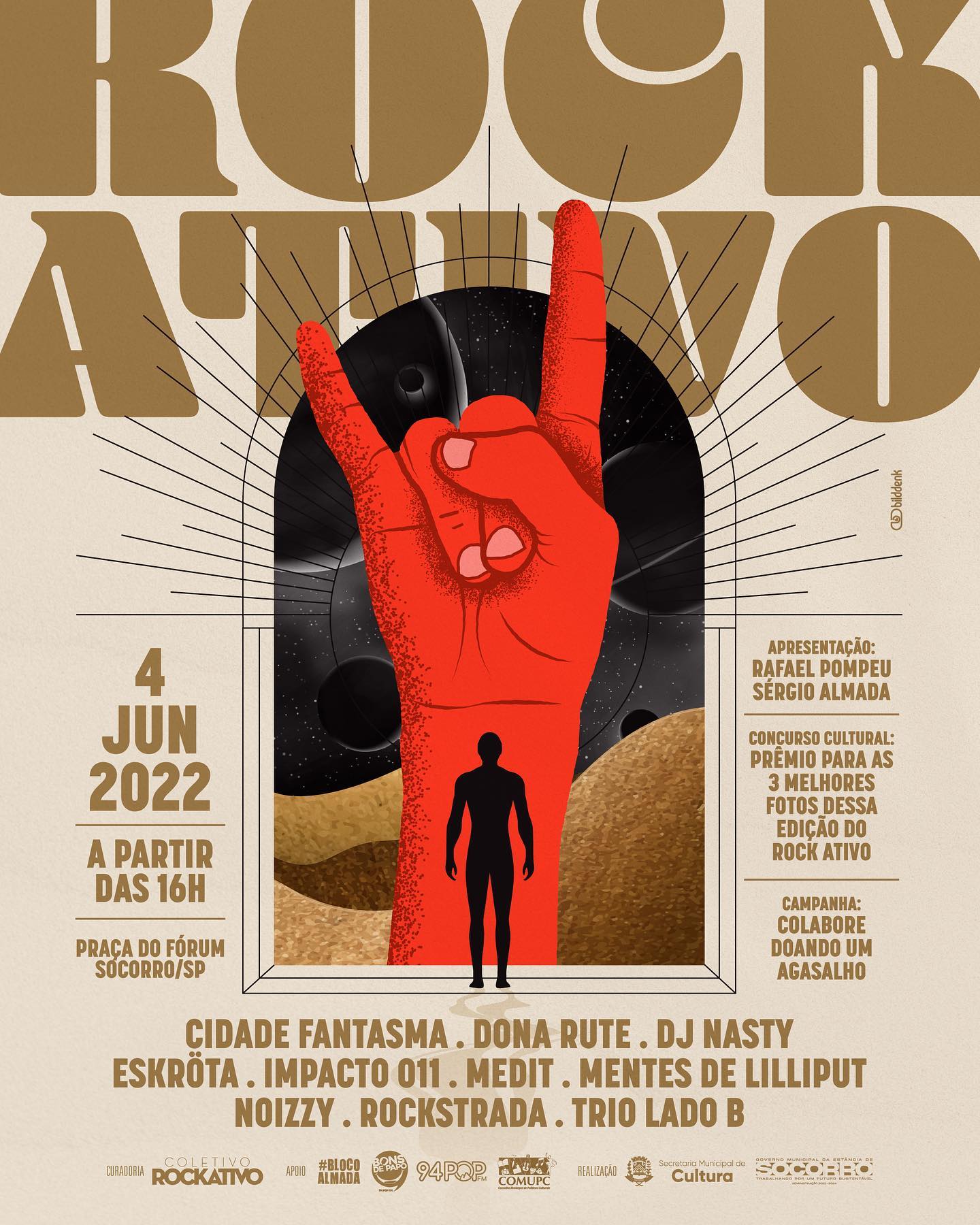 O festival Rock Ativo terá uma nova edição no dia 04 de junho, na Praça do Fórum, a partir das 16h. Nove bandas, de diversas vertentes do Rock, e uma DJ vão se apresentar no evento gratuito realizado pela Secretaria de Cultura da Prefeitura de Socorro, com curadoria do coletivo Rock Ativo, formado por bandas locais, e apoio do Conselho Municipal de Políticas Culturais – Comupc, programa Bons de Papo, da rádio 94 POP FM e do Bloco Almada, do produtor Sérgio Almada, que também vai apresentar o festival.