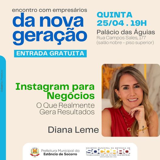 A Prefeitura de Socorro, através da Secretaria de Desenvolvimento Econômico, realiza no próximo dia 25 de abril o Encontro com Empresários da Nova Geração. O evento terá como tema “Instagram para Negócios – O Que Realmente Gera Resultados” e contará com a presença de Diana Leme, especialista em Social Media com anos de experiência no mercado digital.