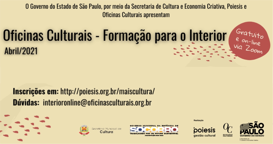 O Governo do Estado de São Paulo, por meio da Secretaria de Cultura e Economia Criativa, Poiesis e Oficinas Culturais, em parceria com a Secretaria de Cultura de Socorro, realizarão ‘’Oficinas Culturais – Formação para o Interior’’. As Inscrições estarão abertas até dia 28 de março, o evento será realizado no mês de abril, online e totalmente gratuito.