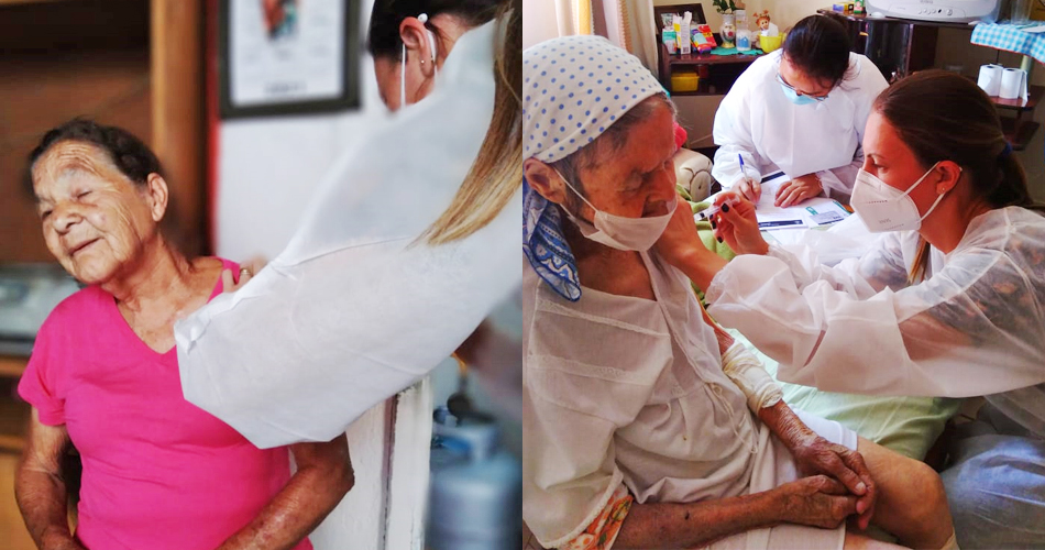 Idosos acamados, acima de 90 anos, recebendo a vacina em casa