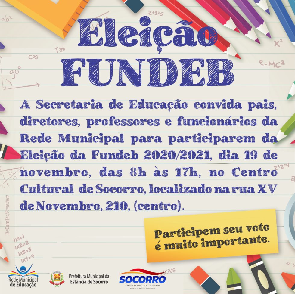 A Secretaria de Educação convida pais, responsáveis, diretores, professores e funcionários da rede municipal, para participarem da Eleição da Fundeb (Fundo Social de Manutenção e Desenvolvimento da Educação Básica e Valorização dos Profissionais da Educação) 2020/2021.