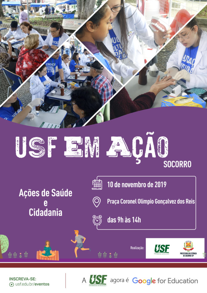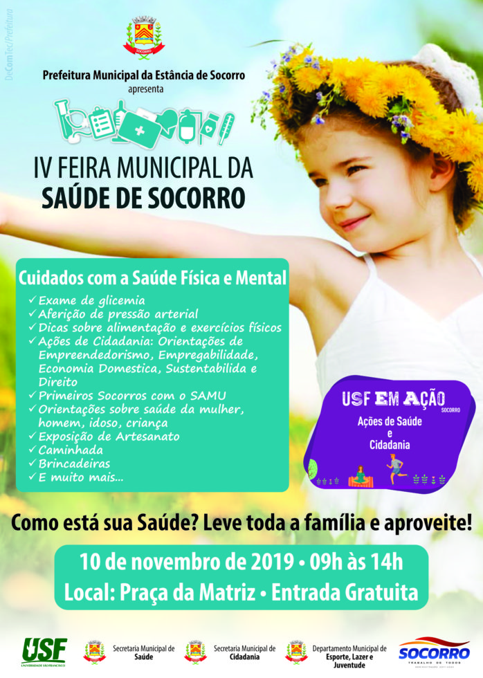 Secretaria Municipal de Saúde, Departamento de Esportes e Lazer e a Universidade São Francisco campus Bragança Paulista organizam pelo terceiro ano consecutivo a Feira da Saúde de Socorro, evento voltado à população que terá caminhada e prestação de diversos atendimentos ao longo do dia. A feira acontece no domingo 10 de novembro, com atividades na Praça da Matriz.