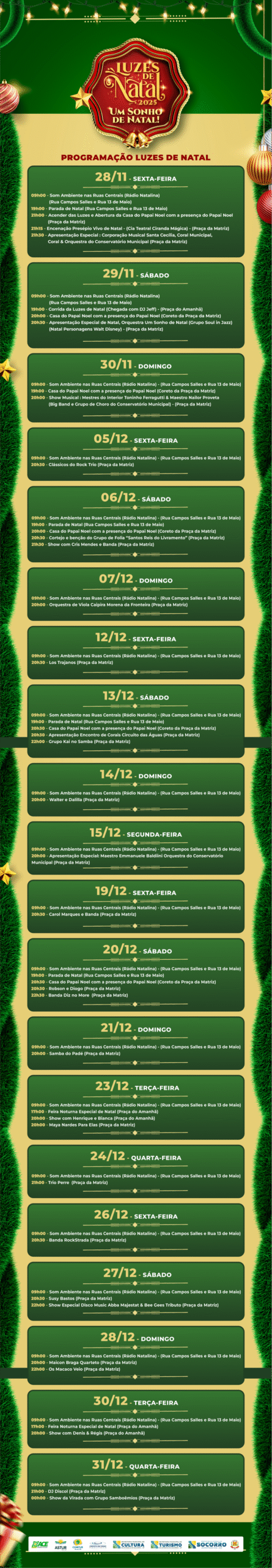 A celebração começa às 19h com a primeira Parada de Natal, que sairá do Palácio das Águias, antigo Paço Municipal, e seguirá pelas ruas Campos Sales e Rua 13 de Maio. Logo após o desfile, acontece o tradicional acender das luzes, quando mais de 10 mil lâmpadas de LED iluminarão ruas, praças e pontos turísticos, transformando Socorro em um grande cenário natalino.