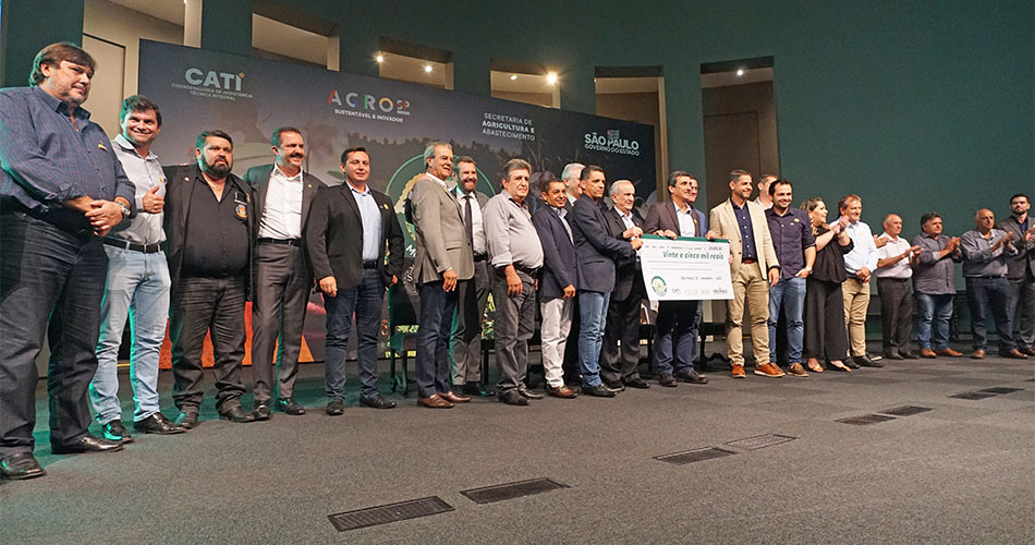 O prefeito Ricardo Lopes participou da entrega do Prêmio Município Agro, da Secretaria de Agricultura e Abastecimento do Governo do Estado de São Paulo, na quarta-feira (30/11), acompanhado de Tiago Sartori – secretário municipal de Meio Ambiente e Desenvolvimento Sustentável e Alexandre Moreira de Souza – diretor do Departamento Municipal de Desenvolvimento Rural.